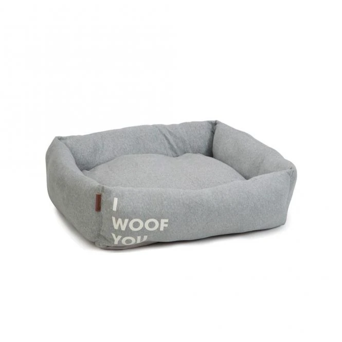 Schriftzug „Woof You“ zu lesen. Das weiche Kissen ist herausnehmbar. Der