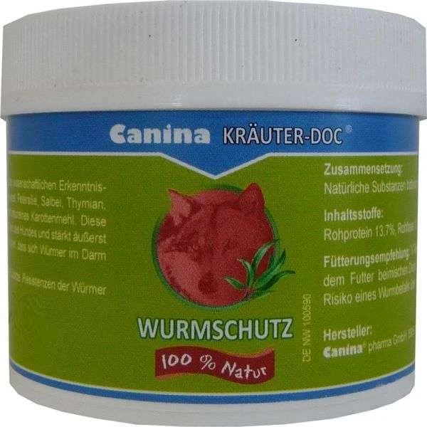 Canina KRÄUTER-DOC® Wurmschutz enthält eine Mischung aus ausgesuchten Kräutern, als Trägerstoff dient naturreines Karottenmehl. Diese besondere Kombination schafft ein ausgeglichenes Milieu im Darm und die darmeigene Abwehr wird unterstützt. Canina KRÄUTER-DOC® Wurmschutz enthält keine chemischen Zusätze – 100 % Natur! , Inhalt: 25g , Zusammensetzung: Kürbissamen, Wermut, Alantwurzel, Petersilie, Salbei, Thymian, Zimt, Pfefferminze, Rosmarin, Oregano, Karottenmehl , Inhaltsstoffe: Rohprotein 13,7%, Rohfaser 13,4%, Rohasche 8,2%, Rohfett 7,1% , Fütterungsempfehlung pro Tier und Tag: 2,5 g pro Tier und Tag mit dem Futter vermischen, über 10 Tage (2,5 g = ca. ½ Teelöffel). Diese 10-Tage-Kur vierteljährlich wiederholen (4 Kuren im Jahr). Während der Trächtigkeit absetzen!