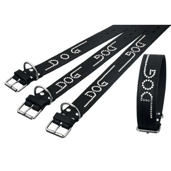 Das Halsband aus der Rondo-Serie von Karlie Flamingo ist mit funkelnden Strassnieten verziert, mit denen das Wort DOG auf dem doublierten, breiten Halsband geschrieben steht. Das doppellagige Leder ist hochwertig abgenäht. Es ist handwerklich genietet und mit verchromten Beschlägen versehen. Made in Germany.