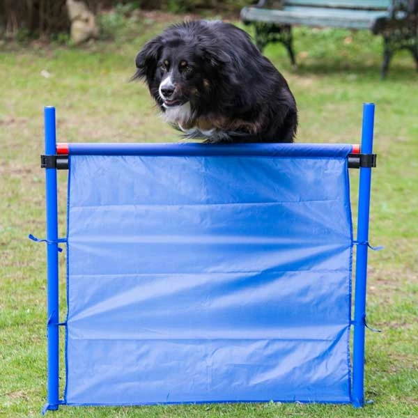 Die Obedience Sprunghürde besteht aus 3 Hürdenstangen, 2 Sprungstangenauflagen und einer blickdichten, reißfesten Folie.